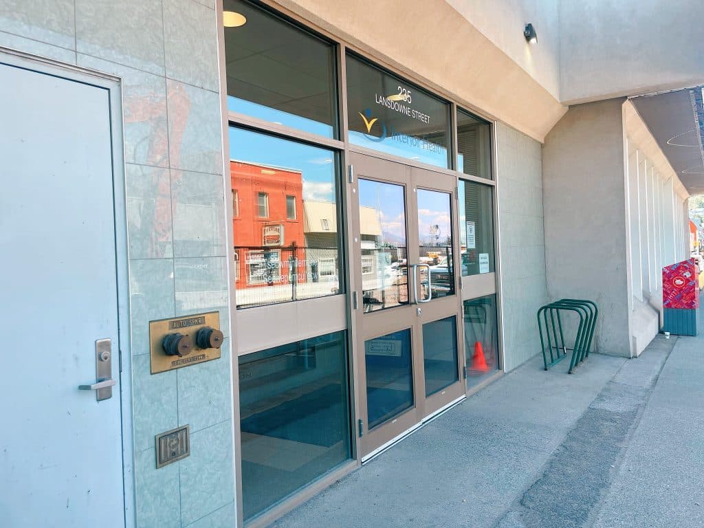 At Interior Health’s Mental Health and Substance Use Services facility at 235 Lansdowne St., visitors are greeted by a neutral-coloured entryway, wheelchair ramp and reception window.